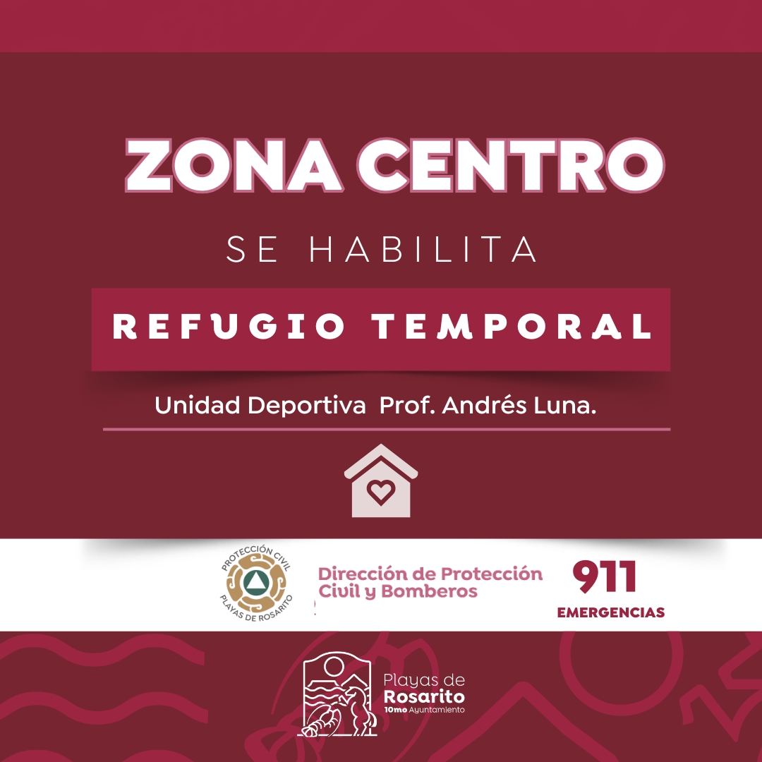 Es por ello que se habilitan los refugios temporales en la Unidad Deportiva Profesor Andrés Luna (Colonia Reforma) y en la zona sur en el Salón Ejidal Primo Tapia. (Carretera Libre Rosarito Ensenada).
