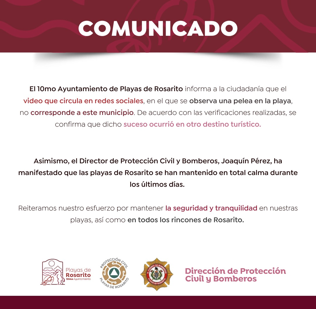 El 10mo Ayuntamiento de Playas de Rosarito informa a la ciudadanía que el video que circula en redes sociales, en el que se observa una pelea en la playa, no corresponde a este municipio.