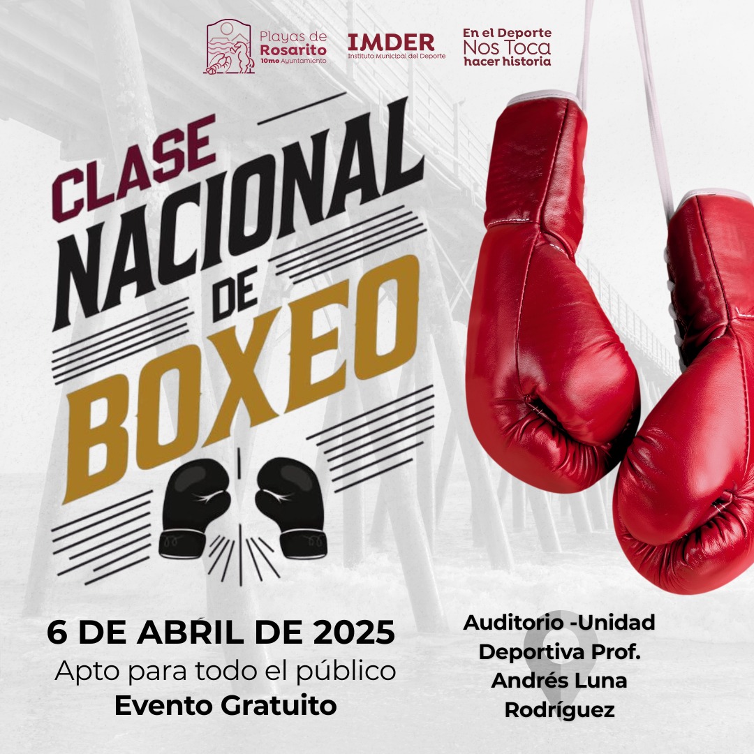 El gobierno municipal que encabeza la Mtra. Rocio Adame Muñoz, a través del Instituto Municipal del Deporte de Rosarito (IMDER), se complace en anunciar la celebración de la Clase Nacional de Boxeo, un evento gratuito y para toda la familia que se llevará a cabo el próximo 6 de abril en la Unidad Deportiva Profesor Andrés Luna.