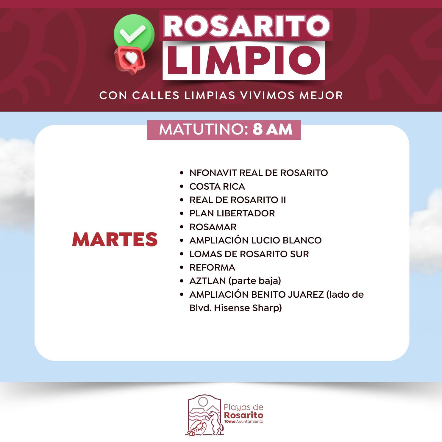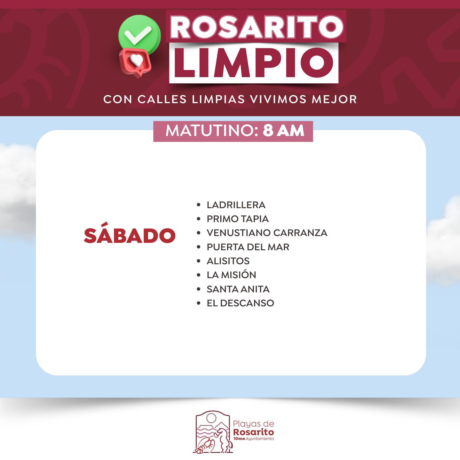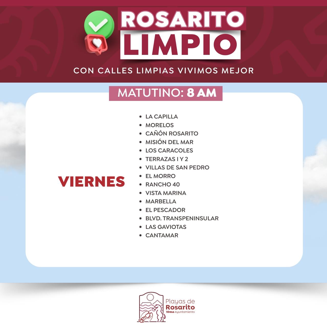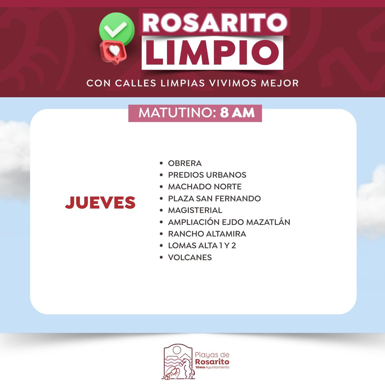 Playas de Rosarito, B.C. 11 de mayo de 2025.- El Gobierno de la Presidenta Municipal, Mtra. Rocio Adame Muñoz, informa a la comunidad sobre los horarios actualizados del programa Rosarito Limpio para la recolección de basura, implementando un esquema de servicio diurno y nocturno en zonas específicas del municipio.