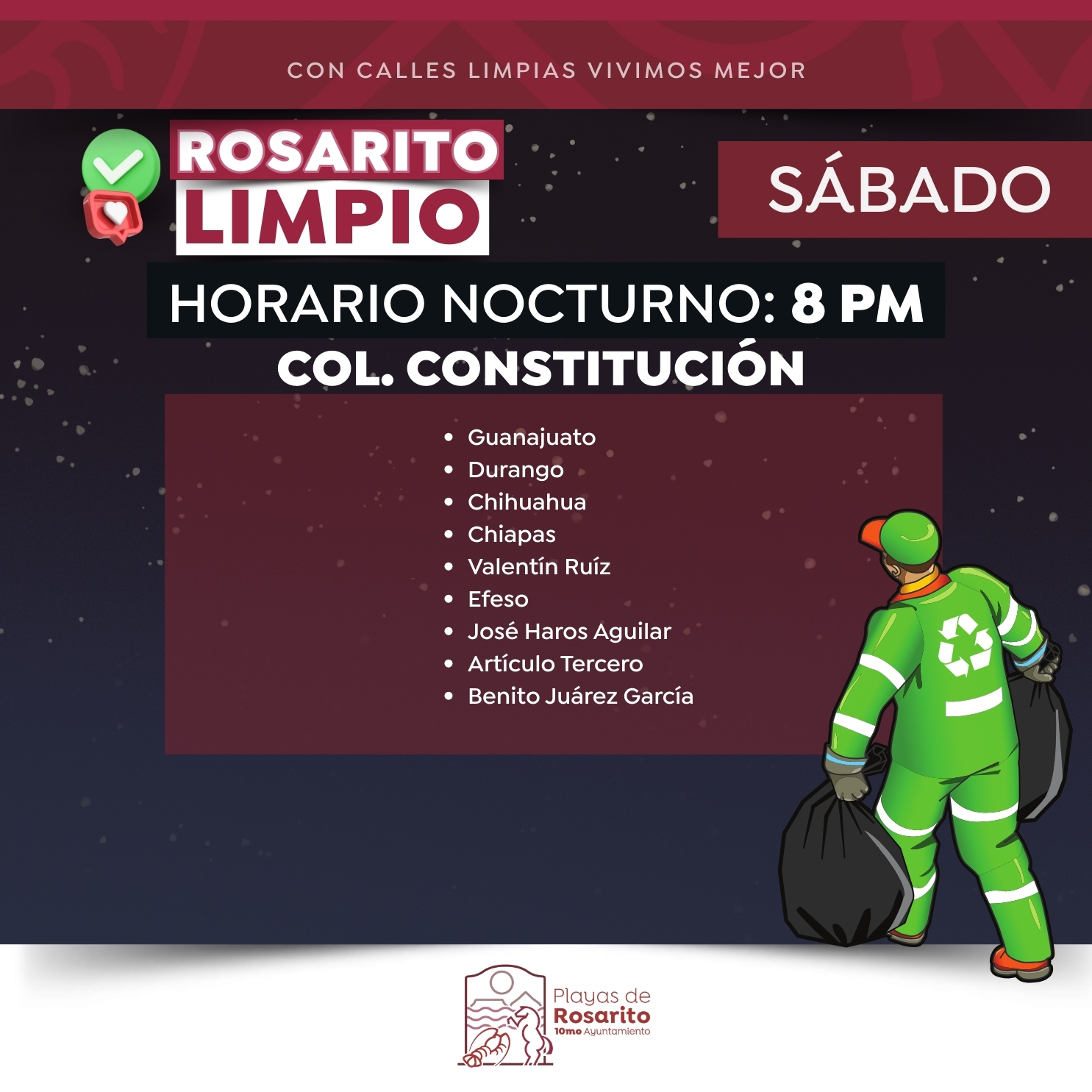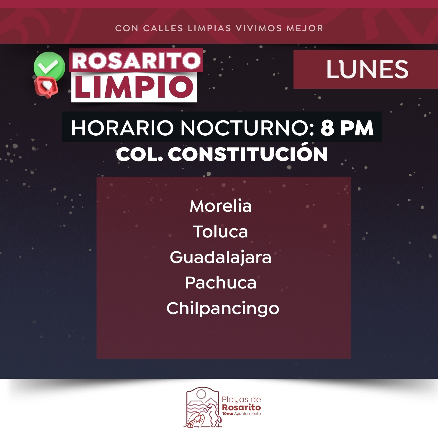 Adicionalmente, se informa que las colonias Constitución y Echeverría contarán con el servicio de recolección de basura en horario nocturno, de acuerdo con un calendario específico que se dará a conocer a los residentes de dichas áreas a través de los canales oficiales del Gobierno Municipal.