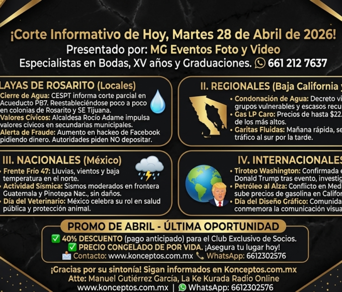 - Mega Desaladora en Rosarito: La CONAGUA anunció que a finales de este mes iniciará la construcción de la nueva planta desaladora de Rosarito, proyectada como la más grande y moderna de América Latina.