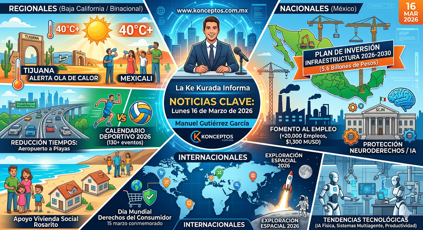 ¡Qué tal, amigos de La Ke Kurada Informa! Soy Manuel Gutiérrez García y aquí les presento el resumen de las 10 noticias clave para nuestro corte de este lunes 16 de marzo de 2026. Iniciamos la semana con información constructiva, positiva y totalmente libre de nota roja para el portal www.konceptos.com.mx.