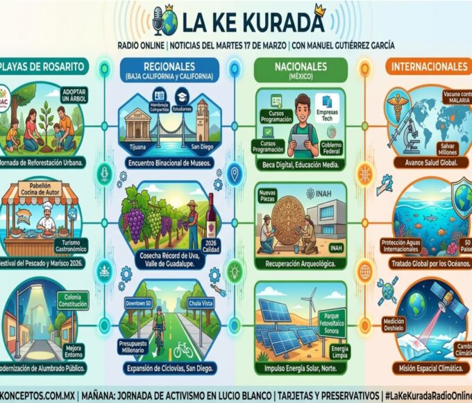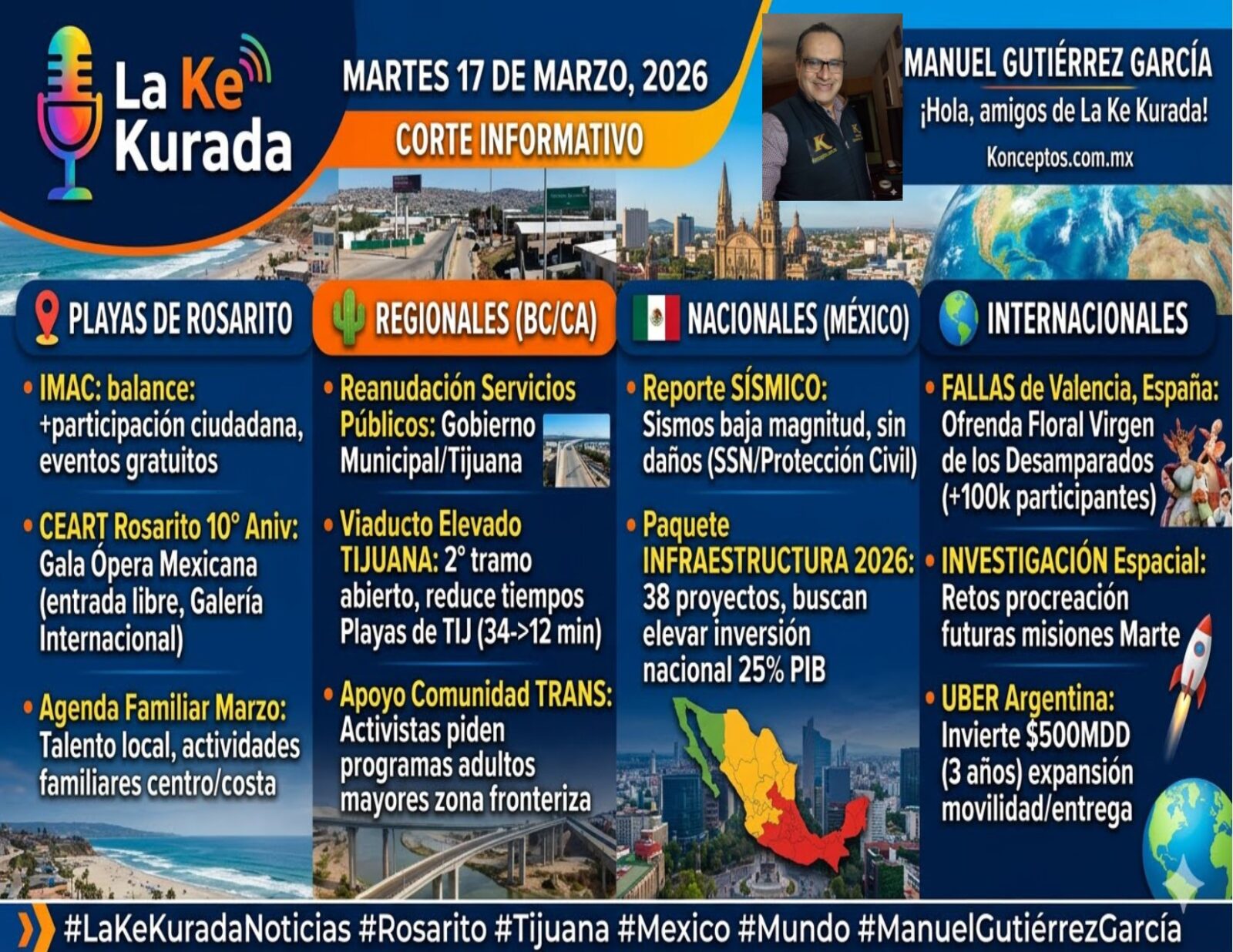 ¡Qué tal, amigos de La Ke Kurada! Estamos de regreso con la información más reciente para este martes 17 de marzo de 2026. Soy su servidor, Manuel Gutiérrez García, y aquí les presento nuestro nuevo corte informativo con lo más relevante de Rosarito, la región y el mundo.