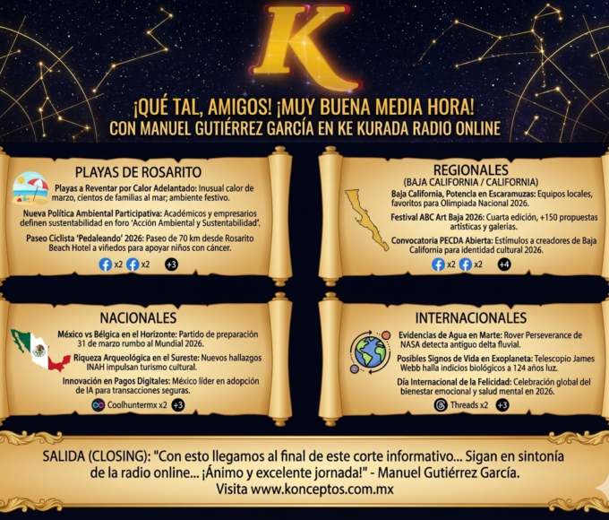 Es momento de darle la vuelta al mundo y aterrizar en nuestra región. En los próximos minutos, les presento el resumen informativo con lo más trascendente de este fin de semana: desde el corazón de Playas de Rosarito, recorriendo Baja California y California, hasta las noticias que están marcando la pauta nacional e internacional.