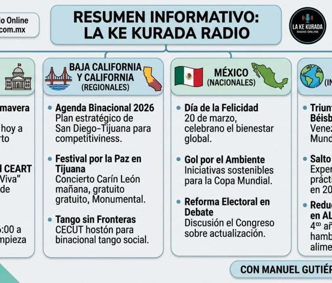 • Agenda Binacional San Diego-Tijuana 2026: Líderes de ambos lados de la frontera avanzan en la creación de una agenda binacional estratégica que prioriza el saneamiento del Río Tijuana y la mejora de la infraestructura turística fronteriza para el resto del año.
