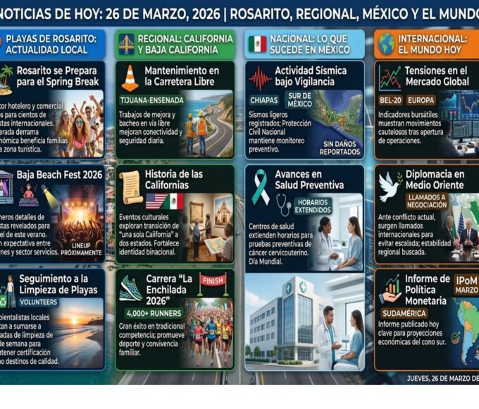 - Crecimiento Gastronómico: Se inaugura hoy un nuevo colectivo gastronómico en la zona norte de Rosarito, destacando el talento de chefs locales y promoviendo el consumo de productos de la región.