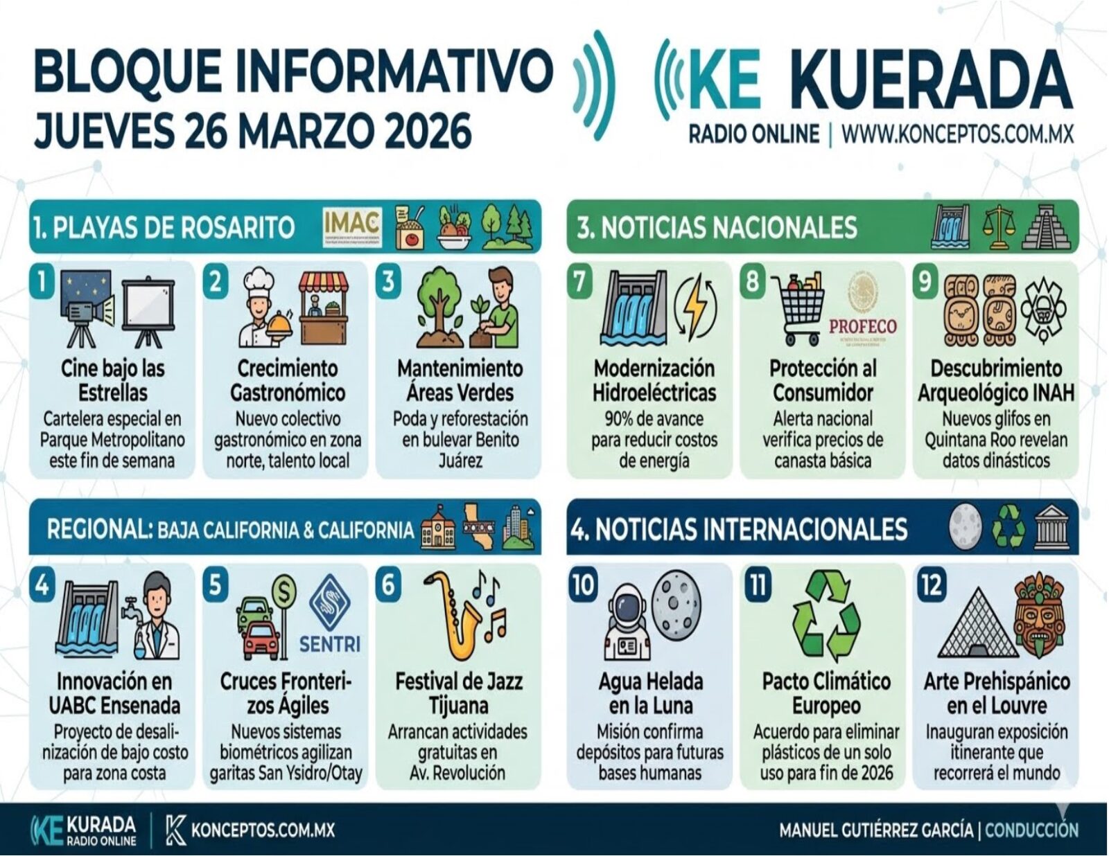 Con esto cerramos este bloque informativo. Gracias por permitirnos acompañarlos un momento más en su jornada. Soy Manuel Gutiérrez García y los invito a seguir disfrutando de la mejor música y contenido en Ke Kurada y, por supuesto, toda la información en www.konceptos.com.mx. ¡Sigamos vibrando alto este jueves!