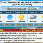 - Clima Primaveral: Para este lunes en Rosarito, esperamos un día que pasará de nublado a mayormente soleado. La temperatura máxima alcanzará los 18°C, con vientos frescos provenientes del oeste. Un clima ideal para actividades al aire libre con la debida protección solar.