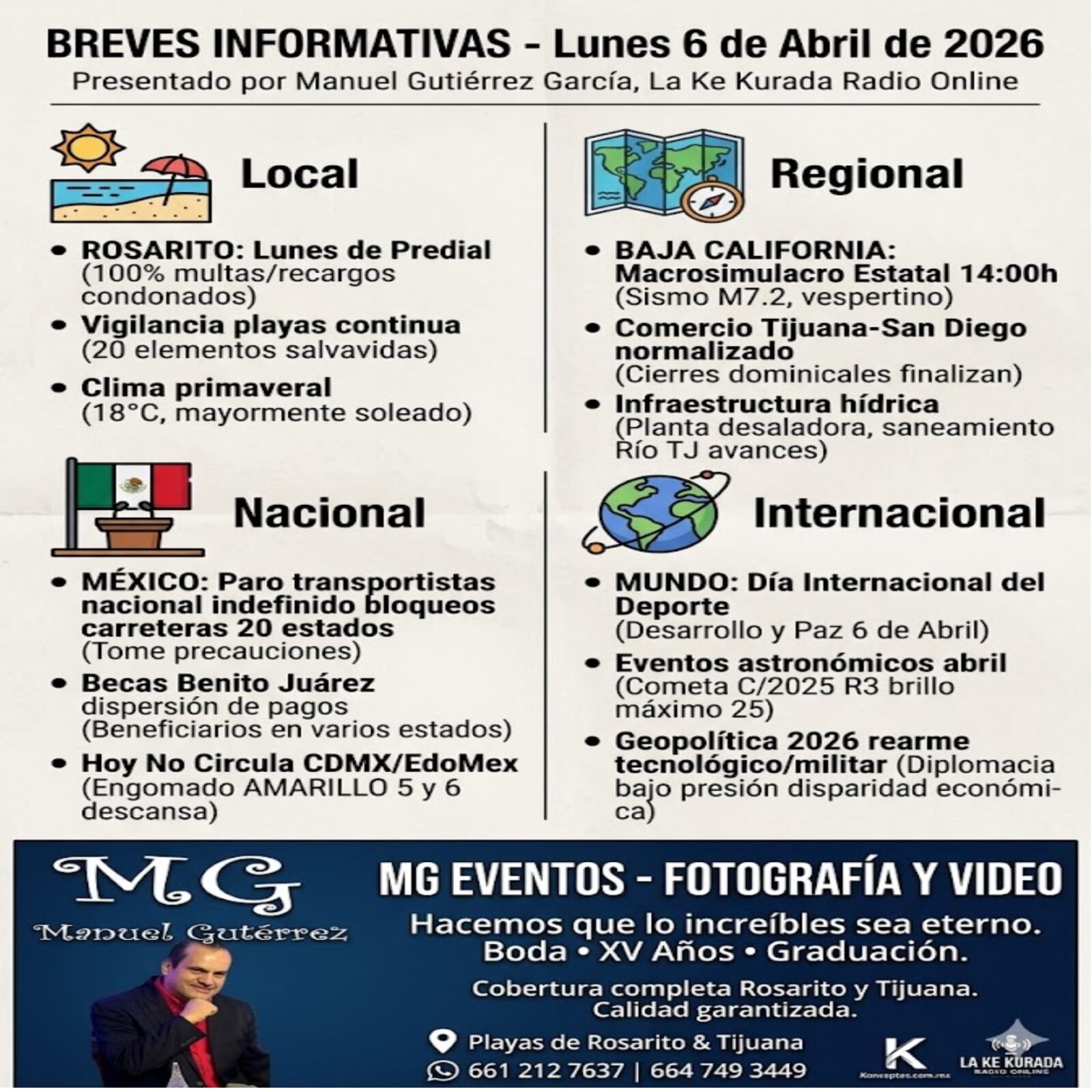- Macrosimulacro Estatal 2026: ¡Atención! Hoy a las 14:00 horas se llevará a cabo el Macrosimulacro Estatal en Baja California. Por primera vez será en horario vespertino y bajo una hipótesis de sismo de magnitud 7.2. Se invita a toda la población a participar con responsabilidad.