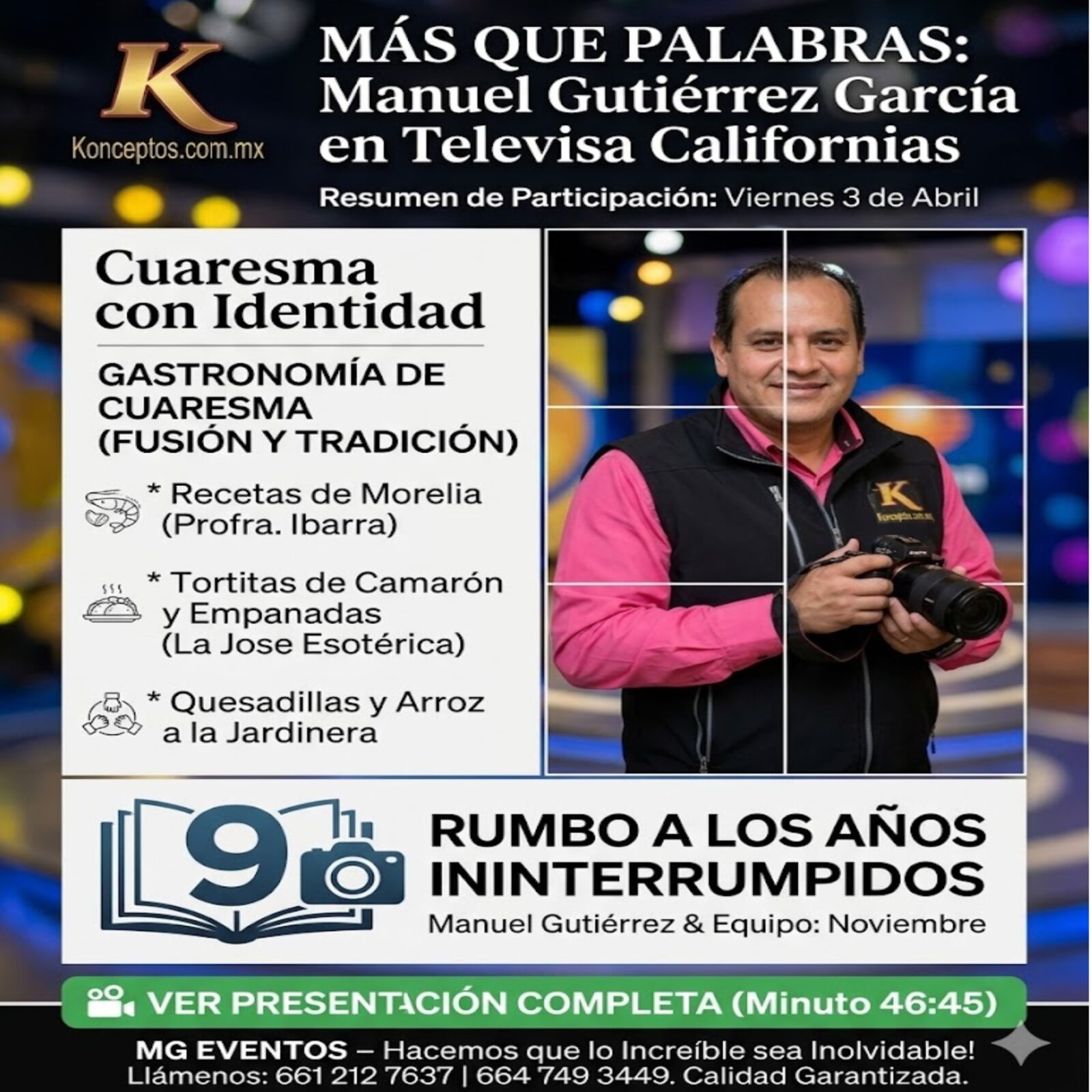 El pasado viernes 3 de abril, las pantallas de Televisa Californias se llenaron de aroma y tradición con la participación de Manuel Gutiérrez García, director general de Konceptos.com.mx, en el programa “Más que Palabras”, conducido por la carismática Bibi Uribe.