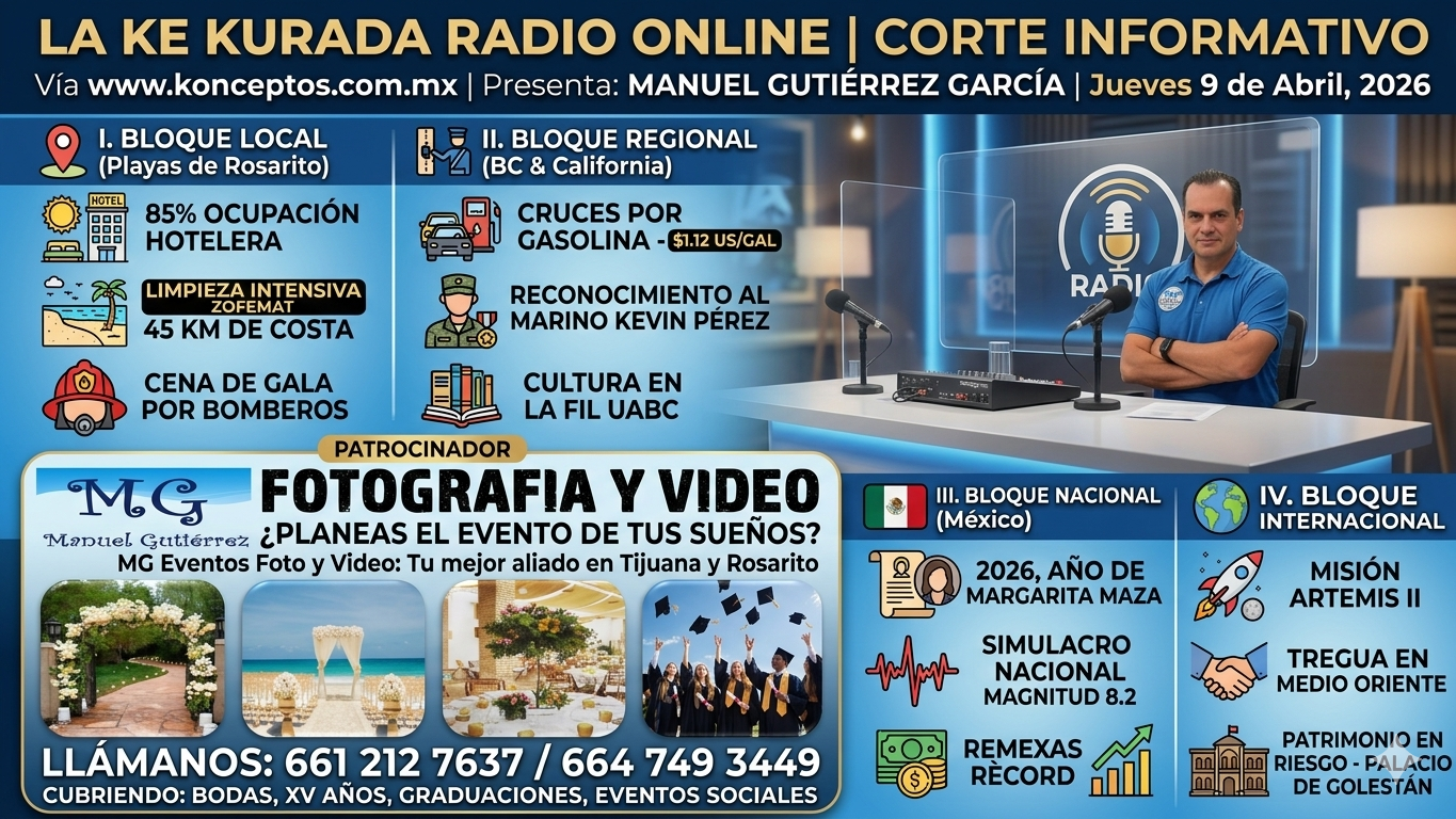 “¡Qué tal, amigos de La Ke Kurada Radio Online! Es un gusto saludarlos a través de nuestro portal www.konceptos.com.mx. Soy su servidor Manuel Gutiérrez García y hoy, jueves 9 de abril de 2026, les presento las 12 noticias más relevantes para iniciar el día bien informados y con enfoque constructivo. ¡Comenzamos!”