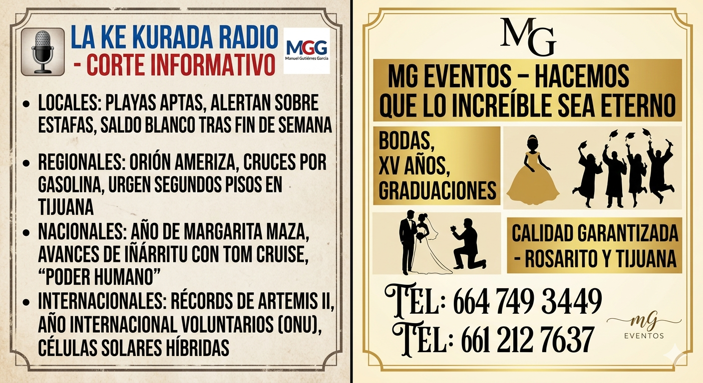 “Recuerde que en MG Eventos hacemos que lo increíble sea eterno. Bodas, XV años y graduaciones con la calidad que solo nosotros ofrecemos en Rosarito y Tijuana. Estamos a sus órdenes en el 664 749 3449 o al 661 212 7637.”