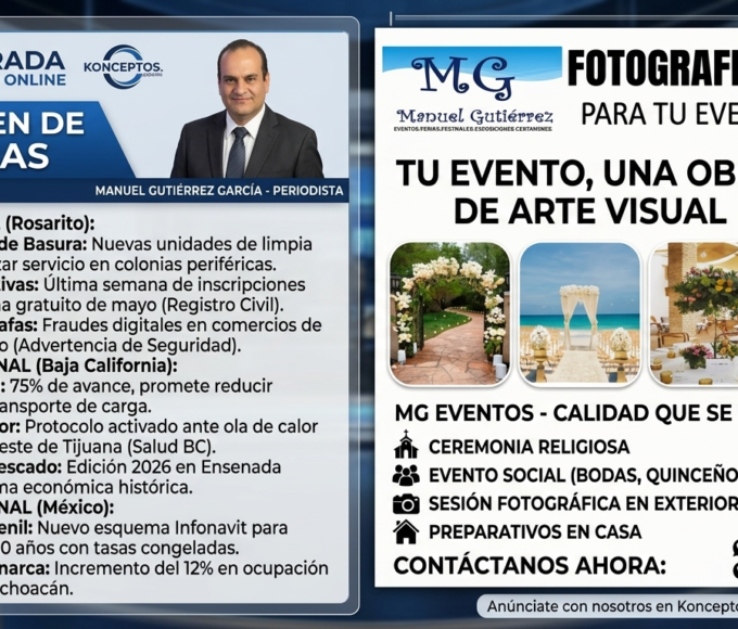 Konceptos es el portal de medios de comunicación líder en Playas de Rosarito, Baja California, consolidado como el referente digital más dinámico de la región. Con una trayectoria enfocada en la inmediatez y la veracidad, el portal ha logrado crear una comunidad sólida que genera más de 15,000 visitas diarias. Nuestra plataforma no solo informa, sino que conecta a las empresas con su audiencia a través de una innovadora estrategia multimedia que combina: Alcance Digital: Más de 18,000 visualizaciones diarias en nuestro portal. Presencia en Radio: Alianza estratégica con La Ke Kurada para transmisiones en vivo. Activación de Marca: Dinamismo puro con el Komunica Dog, nuestra mascota oficial que lleva la publicidad de la pantalla a las calles.