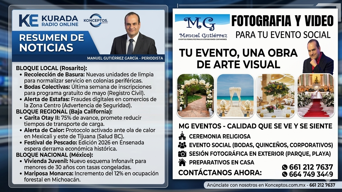 🎙️ “Antes de continuar, ¿tienes un evento en puerta? No permitas que tus mejores momentos se queden solo en la memoria. En MG Eventos Foto y Video, bajo la dirección de un servidor, Manuel Gutiérrez, transformamos tu boda, quinceaños o evento corporativo en una obra de arte visual. Contamos con equipo de alta gama y cobertura en todo Rosarito y Tijuana. Llámanos ahora al 661 212 7637 o al 664 749 3449. MG Eventos: Calidad que se ve y se siente.”