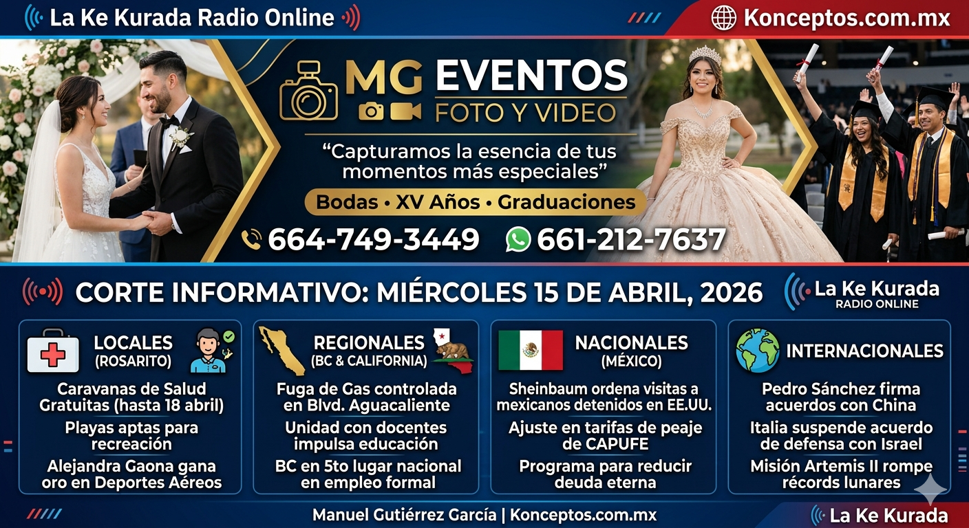 ¡Qué tal, familia de La Ke Kurada Radio Online! Bienvenidos a este corte informativo de hoy, miércoles 15 de abril de 2026. Los saluda con el gusto de siempre su amigo y servidor, Manuel Gutiérrez García, a través de nuestro portal Konceptos.com.mx. Antes de iniciar, les recordamos que este espacio llega a ustedes gracias a MG Eventos Foto y Video. Capturamos la esencia de tus momentos más especiales: bodas, XV años y graduaciones con la calidad que solo un profesional puede ofrecerte.
