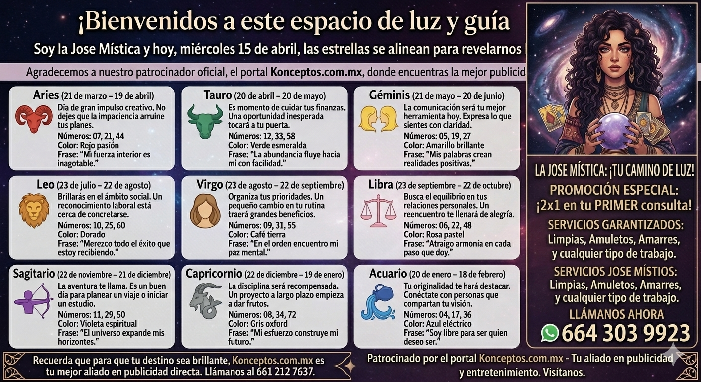 ¡Bienvenidos a este espacio de luz y guía espiritual! Soy la Jose Mística y hoy, miércoles 15 de abril, las estrellas se alinean para revelarnos los secretos del universo. Antes de comenzar, agradecemos a nuestro patrocinador oficial, el portal Konceptos.com.mx, donde encuentras la mejor publicidad y entretenimiento de la región.