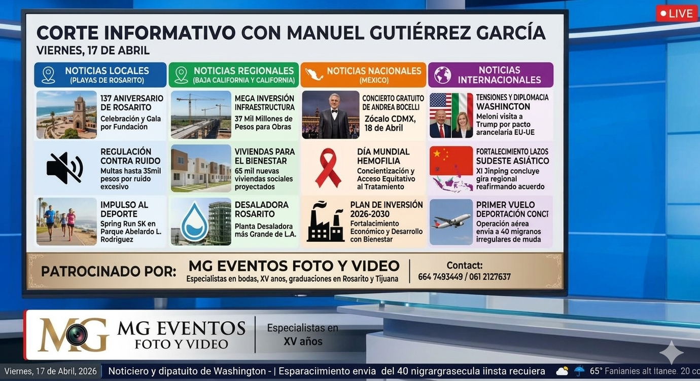 “¡Muy buenos días! Los saluda su amigo Manuel Gutiérrez García. Es un placer recibirlos en este nuevo corte informativo donde compartimos las noticias que impulsan el desarrollo de nuestra comunidad y el mundo. Hoy, viernes 17 de abril, celebramos el optimismo y las buenas acciones. Todo esto es posible gracias a MG Eventos Foto y Video, los especialistas en inmortalizar sus momentos más especiales. ¡Iniciamos!”