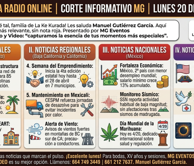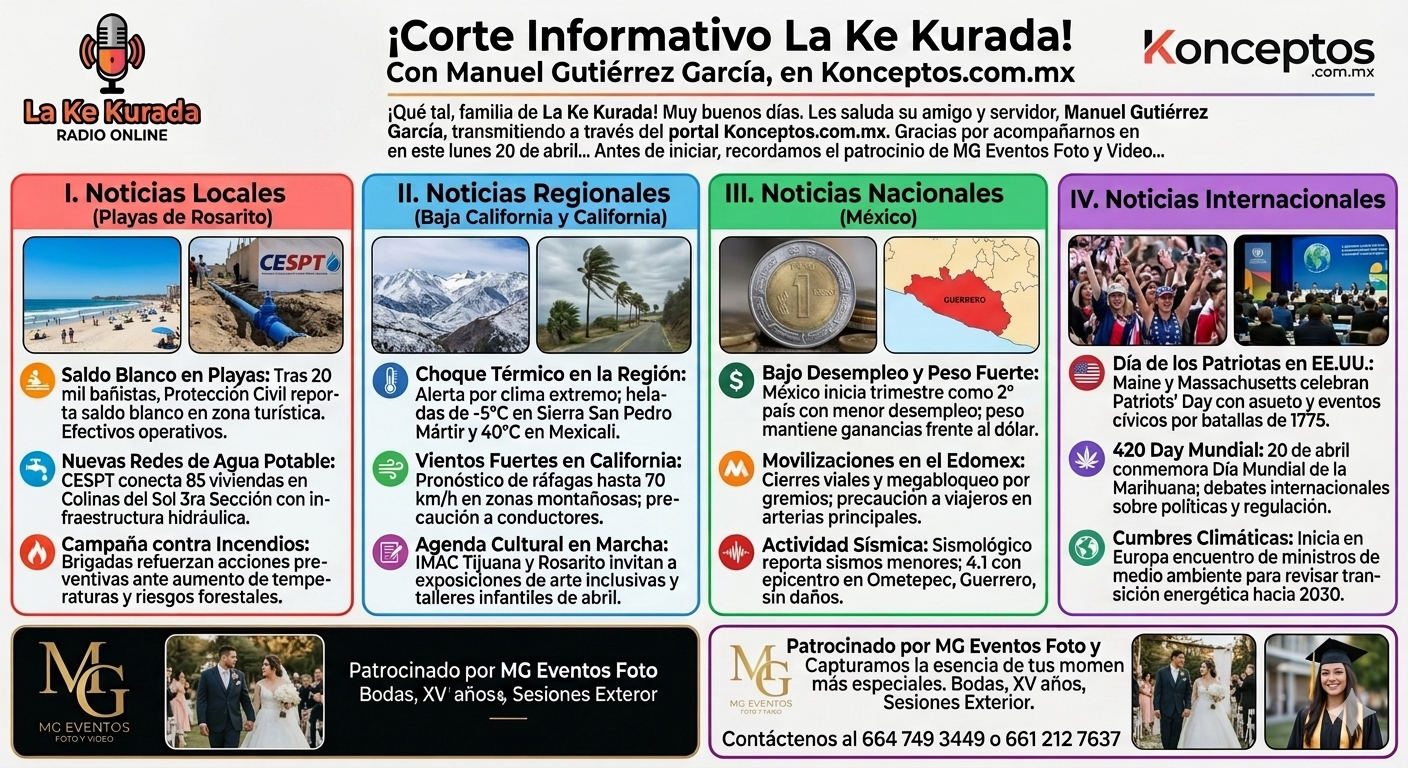 “¡Qué tal, familia de La Ke Kurada! Muy buenos días. Les saluda su amigo y servidor, Manuel Gutiérrez García, transmitiendo a través del portal Konceptos.com.mx. Gracias por acompañarnos en este lunes 20 de abril en una nueva entrega de lo más relevante del día. Antes de iniciar, les recordamos que este espacio llega a ustedes gracias al patrocinio de MG Eventos Foto y Video: capturamos la esencia de tus momentos más especiales. Vamos ahora con el resumen de noticias.”
