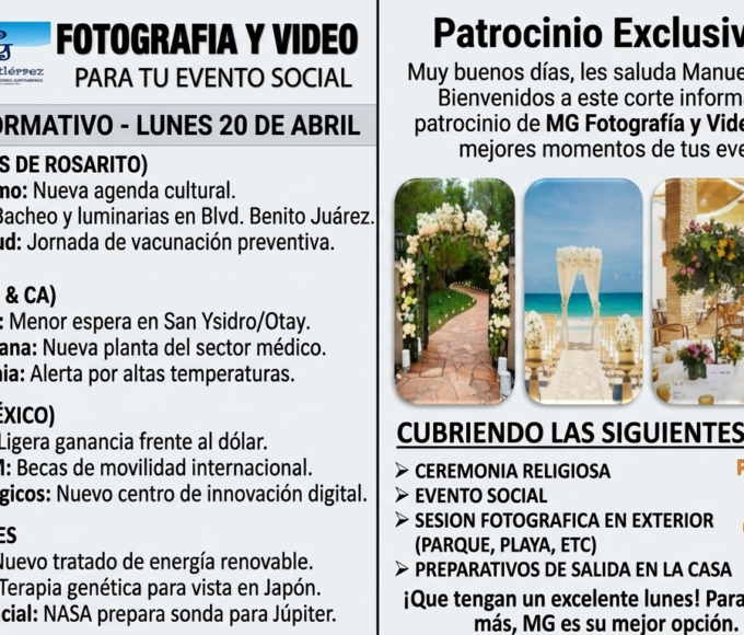 “Estas son las noticias que marcan el rumbo de este inicio de semana. Siga disfrutando de la mejor música y programación aquí en La Ke Kurada Radio Online. Recuerde que para sus bodas, quince años y sesiones en exterior, MG Eventos Foto y Video es su mejor opción en Playas de Rosarito y Tijuana. Contáctenos al 664 749 3449 o al 661 212 7637. Soy Manuel Gutiérrez García, ¡tengan un excelente y productivo lunes!”