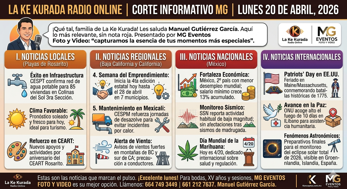 - Semana del Emprendimiento: Hoy arranca la cuarta edición de la Semana Estatal del Emprendimiento 2026 en Baja California; se desarrollará del 20 al 28 de abril en los siete municipios para impulsar el talento local.