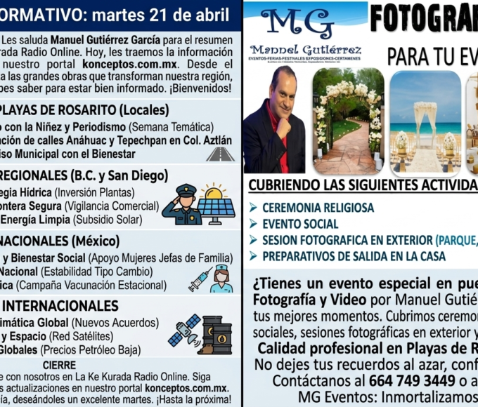 Konceptos es el portal de medios de comunicación líder en Playas de Rosarito, Baja California, consolidado como el referente digital más dinámico de la región. Con una trayectoria enfocada en la inmediatez y la veracidad, el portal ha logrado crear una comunidad sólida que genera más de 15,000 visitas diarias. Nuestra plataforma no solo informa, sino que conecta a las empresas con su audiencia a través de una innovadora estrategia multimedia que combina: Alcance Digital: Más de 18,000 visualizaciones diarias en nuestro portal. Presencia en Radio: Alianza estratégica con La Ke Kurada para transmisiones en vivo. Activación de Marca: Dinamismo puro con el Komunica Dog, nuestra mascota oficial que lleva la publicidad de la pantalla a las calles.