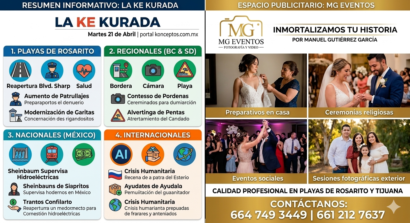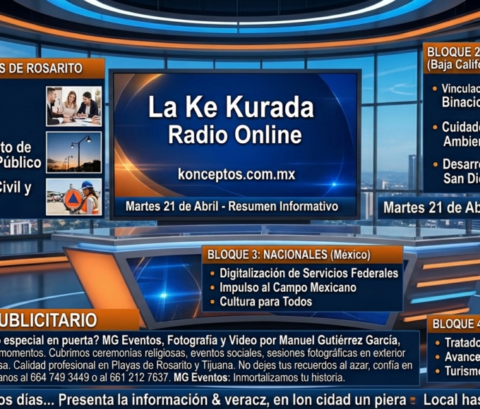 “¿Qué tal? Muy buenos días. Les saluda Manuel Gutiérrez García para el resumen informativo de La Ke Kurada Radio Online. Hoy, martes 21 de abril, les presentamos la información más relevante de nuestro portal konceptos.com.mx. Desde la reapertura de vialidades clave hasta el pulso de la política nacional, aquí comienza lo que debes saber para estar bien informado. ¡Bienvenidos!”