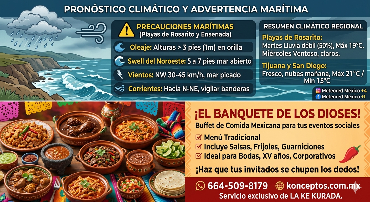 - Playas de Rosarito: Martes con lluvia débil (50% de probabilidad) y máximas de 19°C. El miércoles será más ventoso pero con claros ocasionales.