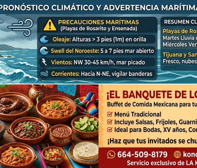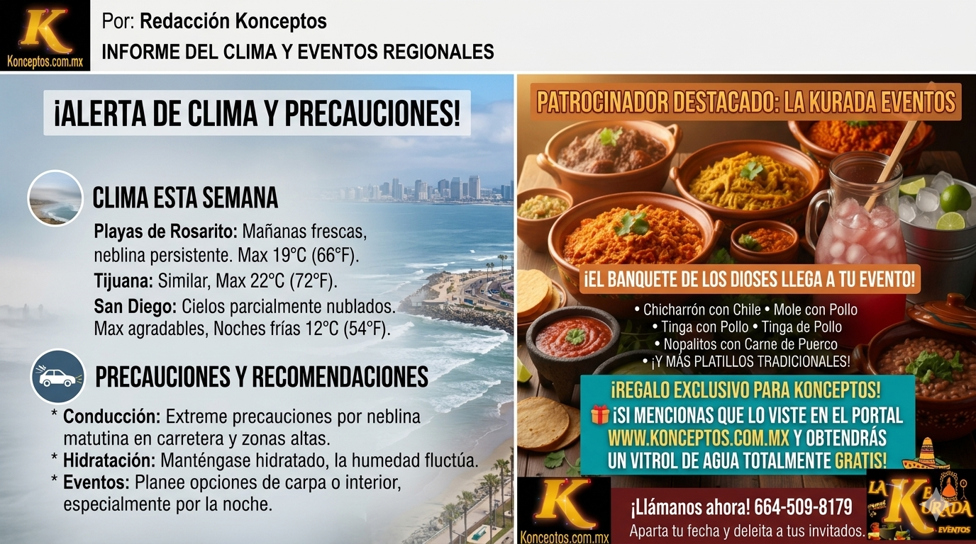 • Playas de Rosarito: Se esperan mañanas frescas con neblina persistente, despejándose hacia el mediodía. Las temperaturas máximas rondarán los 19°C (66°F), con brisas marinas constantes. Ideal para eventos en interiores o terrazas protegidas.