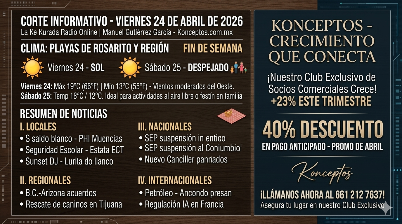 ¡Qué tal, familia de La Ke Kurada Radio Online! Bienvenidos a este primer corte informativo de hoy, viernes 24 de abril de 2026. Los saluda con el gusto de siempre su amigo y servidor, Manuel Gutiérrez García, transmitiendo a través de nuestro portal Konceptos.com.mx.