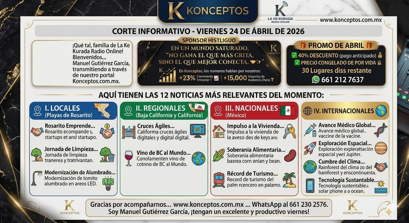 Antes de ir con la información, les recuerdo que en un mundo saturado, “no gana el que más grita, sino el que mejor conecta”. En Konceptos, nuestros números hablan por nosotros con un 23% de crecimiento en este primer trimestre y más de 15,000 impactos de audiencia diaria. ¡No se queden fuera! Aprovechen nuestra Promo de Abril con un 40% de descuento en pago anticipado y congelen su precio de por vida en nuestro Club Exclusivo de Socios Comerciales. ¡Solo quedan 30 lugares! Llámenos a la oficina Rosarito al 661 212 7637.