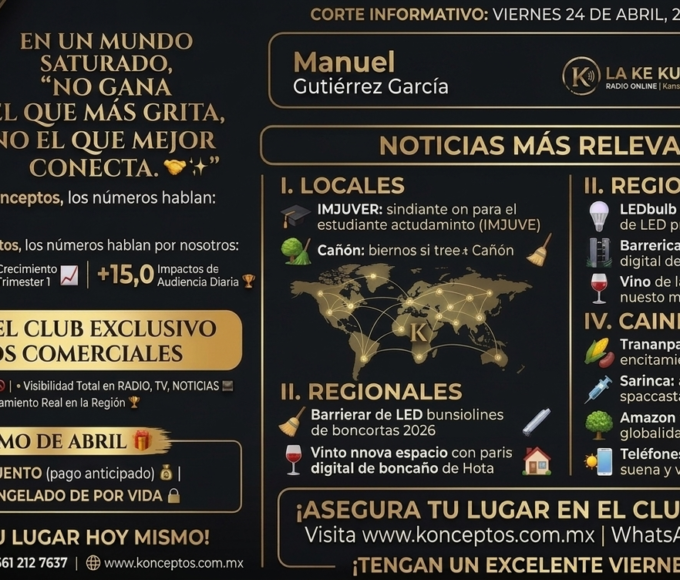 ¡Qué tal, familia de La Ke Kurada Radio Online! Bienvenidos a este nuevo corte informativo de hoy, viernes 24 de abril de 2026. Los saluda con el gusto de siempre su amigo y servidor, Manuel Gutiérrez García, transmitiendo a través de nuestro portal Konceptos.com.mx.