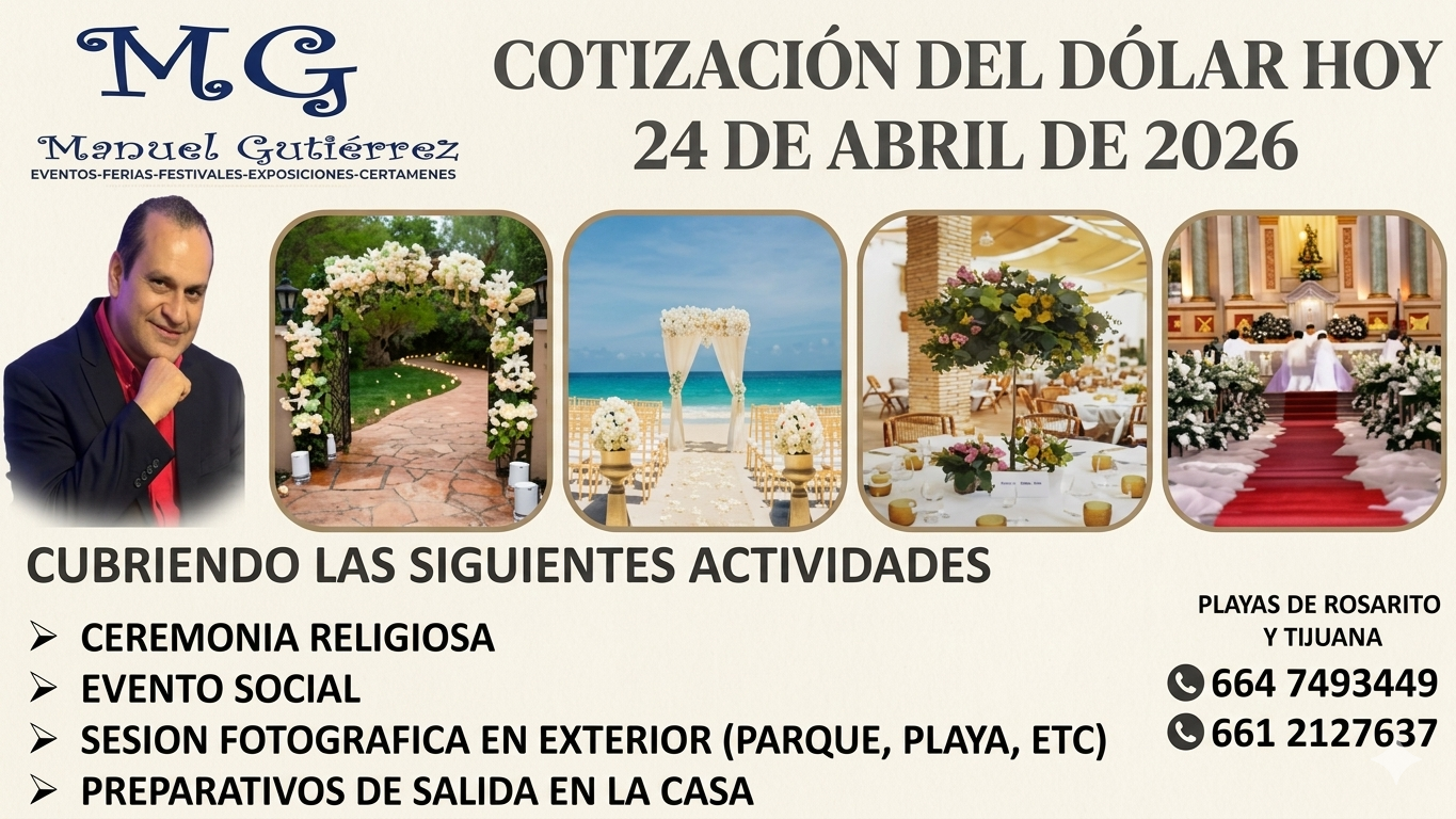 Para este viernes 24 de abril de 2026, aquí tienes el reporte completo de la cotización del peso frente al dólar en la zona fronteriza y el resto del país, patrocinado por Manuel Gutiérrez – MG Fotografía y Video, especialistas en capturar los mejores momentos de tus eventos sociales en Playas de Rosarito y Tijuana.