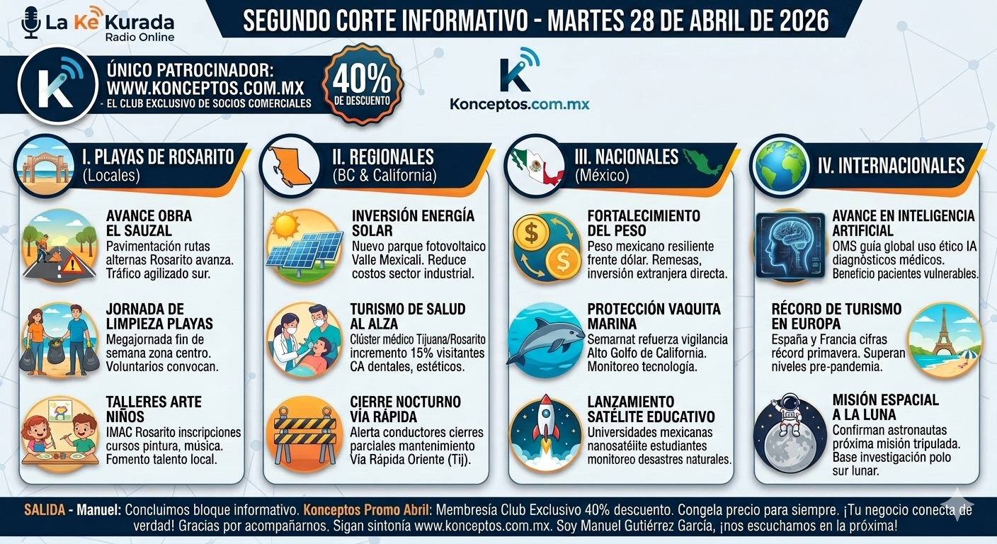 ¡Qué tal, familia de La Ke Kurada Radio Online! Es un gusto saludarlos nuevamente en este segundo corte informativo de hoy, martes 28 de abril de 2026. Soy Manuel Gutiérrez García y estamos transmitiendo para el portal Konceptos.com.mx. Recuerden nuestra máxima: ‘en un mundo saturado, no gana el que más grita, sino el que mejor conecta’.
