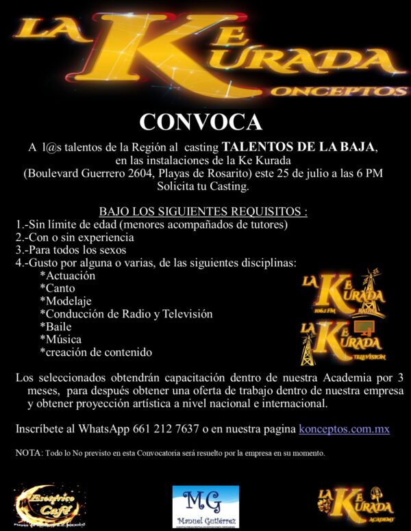 KONCEPTOS.COM.MX   CONVOCA   A  l@s talentos de la Región al  casting TALENTOS DE LA BAJA, en las instalaciones de la Ke Kurada...