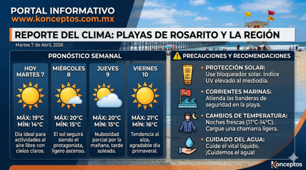 ¡Qué tal, amigos de www.konceptos.com.mx! les traigo el reporte del clima para nuestra querida región de Playas de Rosarito y alrededores. Para este martes 7...